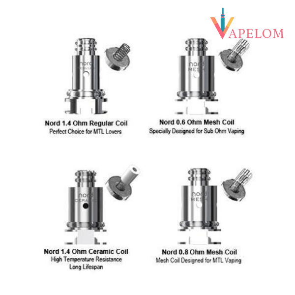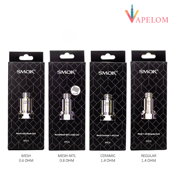 SMOK NORD Coils (5-Pack), a dynamic atomizer structure for the NORD, Trinity Alpha, PRIV N19 and more, featuring the following coil options: 0.6ohm Mesh, 0.8ohm Mesh-MTL,1.4ohm Ceramic, and a 1.4ohm Traditional.