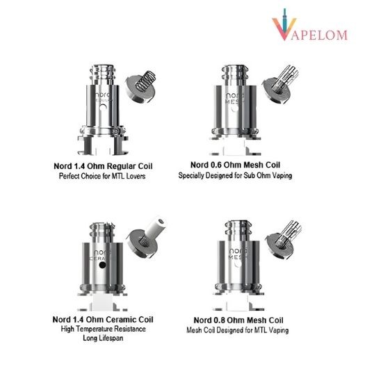 SMOK NORD Coils (5-Pack), a dynamic atomizer structure for the NORD, Trinity Alpha, PRIV N19 and more, featuring the following coil options: 0.6ohm Mesh, 0.8ohm Mesh-MTL,1.4ohm Ceramic, and a 1.4ohm Traditional.